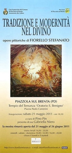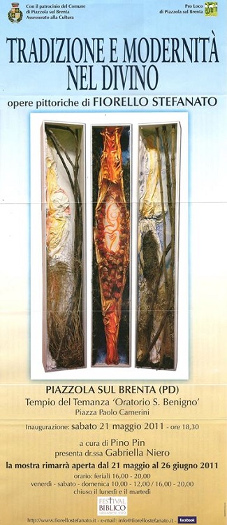 emotiva che alimentano noi stessi e soprattutto le nuove generazioni. Ed è con questa motivazione che il Comune di Piazzola sul Brenta propone l’interessante rassegna d’arte “Di Generazione in Generazione”, un festival biblico che coniuga la citazione di testi sacri antichi a eventi contemporanei. Attraverso il simbolismo della cultura pittorica , e non solo, la manifestazione tende a diffondere soprattutto nei giovani la conoscenza dei fondamenti della religione. Tra i narratori più intensi spicca la personalità di Fiorello Stefanato sensibile autore contemporaneo capace di “raccontare” i grandi terni biblici - dall’Antico al Nuovo Testamento - con un linguaggio incisivo sviluppato attraverso la pittura e lc composizioni d’arte povera. La sua mostra personale allestita all’Oratorio di S. Benigno rappresenta una tappa fondamentale nel viaggio spirituale ed incantato alla scoperta del divino . Tra cultura e tradizione si rivela il profilo di un’esperienza artistica che conduce verso la conoscenza. |
